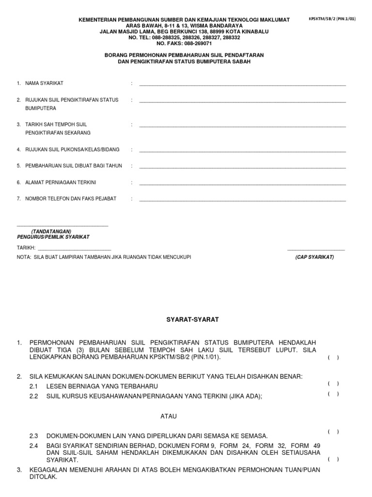 Borang Permohonan Pembaharuan Sijil Pendaftaran Dan Pengiktirafan Status Bumiputera Sabah 2